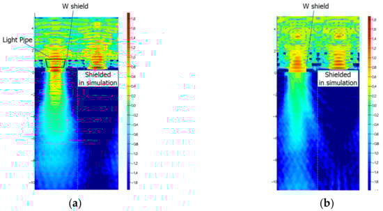 As discussed in previous sections, LP technology can confine incident light into a narrow region on the silicon surface. Reported approaches to enhance the quantum efficiency of NIR are (1) a thicker silicon photoresponse region [18], (2) adopting a reflection part [19], and (3) scattering structure [20]. For a GS pixel with a MN, approach (1) is preferred, because reflected or scattered light would go into the MN, which degrades 1/PLS significantly. A thicker silicon photoresponse region causes another issue of MTF, since angled incident light will cause electrons to be generated laterally far away from its impact point in the surface. LP technology can be applicable to realize good confined incident light into silicon and bring good MTF for NIR enhanced pixels. Figure 17 shows the simulation results of electric field distribution of incident light into 2.8 μm-pitch pixels with and without a LP when the wavelength of incident light is 850 nm. A smaller power of light close to the W-shield is clearly shown in Figure 17a compared with Figure 17b. That also brings confined light into the silicon body.