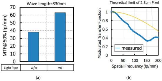 (a) Comparison of an MTF@50% contrast of a pixel with a light pipe and without a light pipe (wavelength is 830 nm, including the MTF of the camera lens). (b) Spatial frequency dependence of the MTF of a pixel with a light pipe (wavelength is 940 nm not including the MTF of a camera lens). MTF: modulation transfer function.