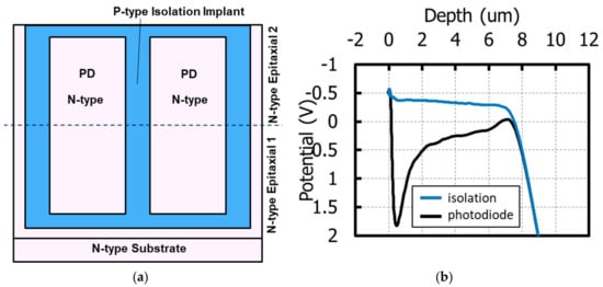 For further improvement of MTF, electrical cross-talk should be reduced in addition to reducing optical cross-talk. In order to achieve that, a well isolated and deep PD is required. In order to realize such a PD, we already developed stacked deep photodiode (SDP) technology [21]. The simple cross-section schematic of the SDP structure is shown in Figure 20a. SDP consists of N-type epitaxial 1 and epitaxial 2 containing PDs and isolations. PD and isolation are formed in epitaxial 1, followed by the growth of epitaxial 2. Another PD and isolation are formed in epitaxial 2 with perfect alignment and connection to lower PD and isolation. In this report, we adopted the SDP technology to a 3.2 μm pitch GS pixel of which the PD depth was 7 μm. As shown in Figure 20b, the 7 μm PD is isolated from the N-type substrate. The isolation between PDs is also successfully formed. Therefore, the possibility of electrical cross-talk from an epi wafer deeper than PD and from adjacent pixels is well suppressed.