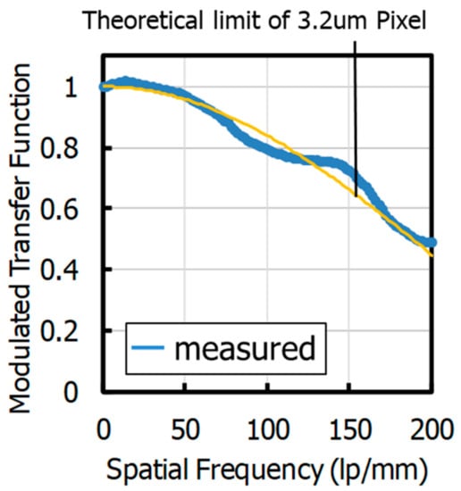 Figure 19a shows a comparison of the measured MTF@50% contrast of a pixel with LP and without LP when the wavelength is 830 nm. These MTF values include the MTF of the camera lens. The MTF with LP was 1.6 times better than that without LP. Details of the spatial frequency dependence of MTF of a pixel with LP are shown in Figure 19b, where these MTF values do not include the MTF of the camera lens in order to compare with theoretical limits of the pixel. When the wavelength was 940 nm, the MTF@50% was 109l p/mm, and the QE at 940 nm of fabricated 2.8 μm GS pixel with LP was 11%. There is a difference between the measured MTF and the theoretical limit of MTF of 2.8-μm pitch pixel. That implies the existence of cross-talk, even with a LP, and the major factor would be electrical cross-talk due to the flat potential region.