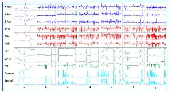 Graph displaying sensor values for a single user’s monitored activities. Sensed values are (x, y, z) acceleration, yaw, pitch, roll, latitude, longitude, altitude, course, and speed. The corresponding activity categories are a = sleep, b = work, c = eat, d = exercise, e = travel, f = hygiene, and g = hobby.