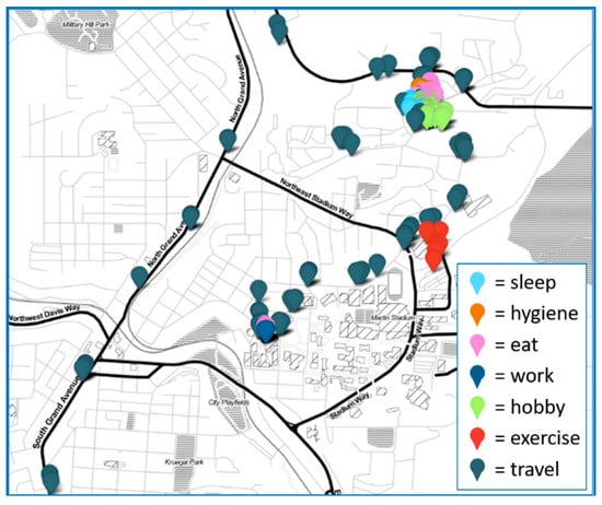Map of locations visited over the course of a single day for one user with corresponding activity labels.