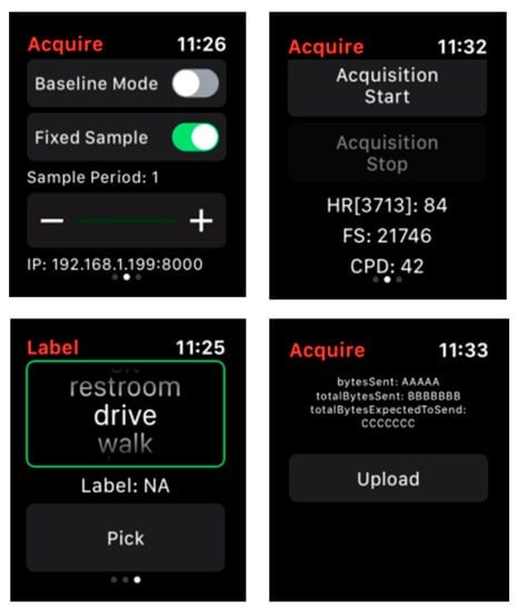 Screenshots of the CPAM app. These functionalities allow the user to (top left) specify the sampling rate, (top right) start and stop data acquisition, (bottom left) provide a label for the current activity, and (bottom right) send collected and labeled data to a server.