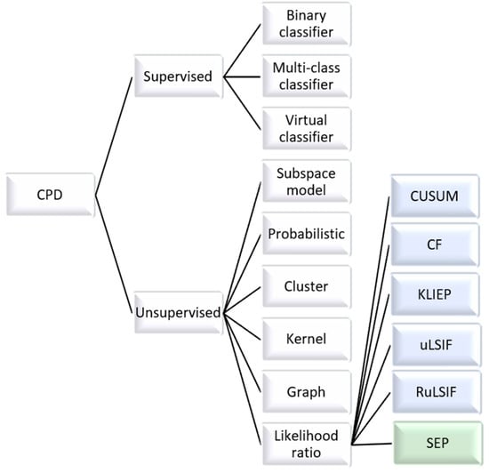While change point detection (CPD) is a thoroughly-investigated topic, some traditional approaches to change point detection, shown in Figure 6, are not appropriate for this problem. Supervised approaches are trained on sample change points []. They can be very effective, but they require training on a sufficient number and diversity of labeled examples, which makes them less useful for a variety of activity data. These training data may provide examples of change point versus non-change point sequences (for binary classification) or of transitions between specific process states for multi-class classification.