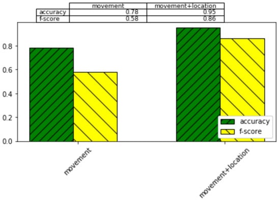 Experiment results are displayed in Figure 9. As the graph shows, recognition of activities of daily living benefits from sensing both movement and location. This finding is confirmed by both accuracy and f-score measures. Here, the difference in performance between movement-only sensors and movement sensors combined with location information is statistically significant (p < 0.05). Future work may reveal that the role of movement sensors is more impactful than location sensors for the recognition gestures and ambulation categories such as sit, stand, lie down, and run.