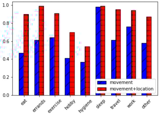 Next, we further analyze these two data sources by considering the f-score for each individual activity category using movement features and combining movement with location features. These results are plotted in Figure 10. These f-scores highlight which activities depend most heavily on location information. The activities that are most dramatically impacted (based on difference in f-scores) are eat, errands, travel, and hobby. The results are intuitive because these activities are easily distinguishable based on location type (e.g., restaurant, store, highway, movie theater) and movement alone may not be as distinct for the activity categories. In contrast, sleep is almost as easy to recognize with movement sensors alone as when all sensors are used. The type of movements and the body orientation are quite different than for other activity categories, so movement sensors alone are likely sufficient in this case.
