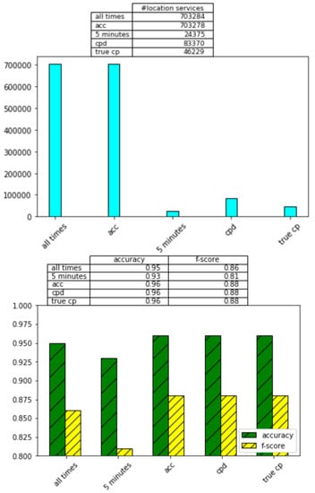 (top) Activity recognition accuracy for all times, acc, 5 min, CPD (CPAM), and true change point sampling strategies. The following accuracy and f-score differences are statistically significant. (p < 0.05): acc and all times, acc and 5 min, CPD and all times, CPD and 5 min, true cp and all times, true cp and 5 min. The changes in activity recognition performance between acc, CPD, and true cp are not statistically significant. (bottom) The number of location samples that are collected for the all times, 5 min, acc, CPD (CPAM), and true cp sampling strategies.