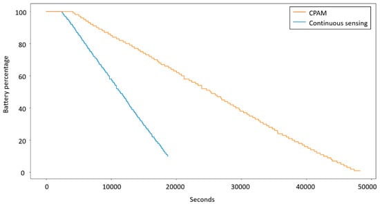 To obtain a practical perspective on energy consumption using CPAM for continual data collection, one subject wore a smartwatch continually for two weeks. The watch was charged each night and worn during the day until the battery was completed drained. Data was collected for one week with continuous sampling of movement data and location data, together with activity labeling. Data was collected for a second week using CPAM-based data sampling. Figure 14 graphs the averaged battery consumption using the two methods. Using continuous sensing, the battery drains in approximately 5 h. Using CPAM, data can be collected and labeled for almost 15 h without needing to charge the smartwatch.