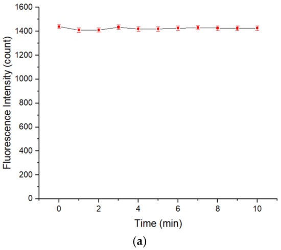 (a) Relationship between the fluorescence intensity of a QD solution without etching and time. Concentration of Tris-HCl buffer solution: 10 mmol/L. pH of Tris-HCl buffer solution: 8.5. Concentration of added QD solution: 5 μmol/L. Addition order: Tris-HCl buffer solution (2 mL) → QD solution (0.4 mL) → Tris-HCl buffer solution (1.6 mL). Excitation wavelength: 460 nm. Observation time: 10 min. (b,c) The fluorescence response of a QD solution without etching. Concentration of Tris-HCl buffer solution: 10 mmol/L. pH of Tris-HCl buffer solution: 8.5. Concentration of added QD solution: 5 μmol/L. Addition order: Tris-HCl buffer solution (2 mL) → QD solution (0.4 mL) → Tris-HCl buffer solution (1.6 mL). Excitation wavelength: 460 nm. All data in this figure is mean of five measurements.