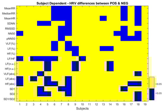 Looking at the statistical differences between positive and negative emotions at the studied HRV variables, no significant differences were found at the SI level. Contrary, significant differences appeared at the SD level for some of the variables and subjects (Figure 2); however, no clear general patterns were found that would allow conclusions to be drawn about the population. As HRV gender differences are demonstrated in young people, we have assessed differences at the SI level for women and men. Significant differences were found between positive and negative emotions at the SD2 variable (p-value = 0.0498) for women; and at the NN50 variable (p-value = 0.0382) for men. SD2 index showed higher values during the processing of negative emotional stimuli, suggesting greater long term variability during the experience of negative emotions for women. On the contrary, higher values of NN50 variable were presented during the processing of positive emotions in comparison with negative emotions, i.e., there is greater variability between contiguous beats in the positive condition for men.