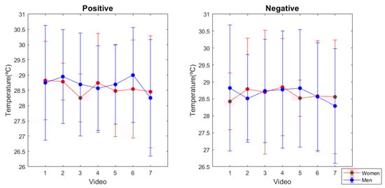 Looking at gender differences, skin temperature values for positive emotions showed no significant differences between women and men samples (p-value = 0.1502), but negative emotions did (p-value = 0.0017) (Figure 3). If we disaggregate the population sample by gender, significant differences were presented in the women positive vs negative emotions (p-value = 1.7237 × 10−42). Contrary, no differences were found for men (p-value = 0.7738).