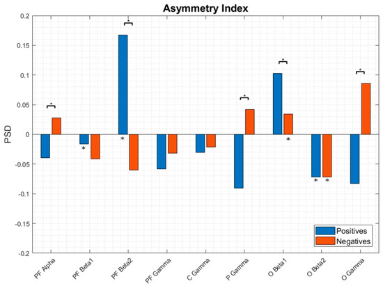 AI for the nine studied frequency-location pairs at positive and negative emotions for all subjects. The bracket with the asterisk above, which joins two bars of the histogram, indicates those pairs that have shown significant differences (p-value < 0.05) between the positive-negative conditions. Asterisks on the bars indicate significant differences (p-value < 0.05) between interhemispheric, intra-condition (positive-positive or negative-negative).