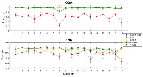 After the assessment of the differences between positive and negative emotional categories at the ECG and skin temperature signals, we wanted to evaluate their contribution to the classification of emotions, assessing if it is better to take into account the central nervous system or autonomic nervous system by themselves or if a synergy between brain and body exists. To this end, we have performed a SD and SI classification with the KNN and QDA classifiers using different inputs. Figure 5 shows the f1 scores for the SD classification, and Figure 6 the SI results.