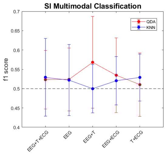 F1 scores for the SI approach at the different multi-modal classifications performed with the KNN and QDA classifiers. The black dotted line corresponds to value of chance.
