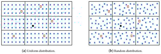 To construct a database of WiFi fingerprints, a mobile node moves freely in each zone of the target area and measures the RSSIs of WiFi signals from all APs. Suppose corresponds to the RSSI measured inside zone with respect to . Let be the number of RSSI measurements taken in zone . This implies that for a certain zone and a given AP, a set of values is collected representing the variations of the RSSIs in this zone with respect to that AP. Let be the total number of measurements. A database of RSSIs labeled to the zones is then obtained. This database describes the variability of the RSSIs within and between the zones. Figure 1 shows a grid of reference RSSI measurements collected in uniform and random distributions.