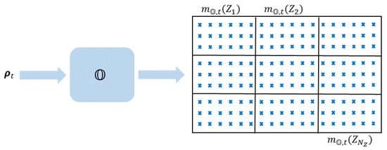 where A is a singleton of . The mass obtained by Dempster’s rule is shown in Equation (17), but the conjunctive and disjunctive rules can be equivalently used. The pignistic level is equivalent to the probability of having the observation belonging to the considered subset. Using this concept, the level of confidence associated with each zone by the basic observation model at each instant t can be computed as follows,