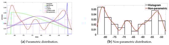 Having a set of observations , collected in zone , the aim of this section is to fit these observations to statistical distributions that represent the variation of the RSSIs inside the zone. Although a multi-dimensional distribution can be used for this purpose, we consider here the uni-dimensional case for the following reasons. At first, uni-dimensional distributions are easier for analysis and computations, especially when the number of APs is large. In addition, they allow considering the reliability or error rate of each AP to discount the assigned evidence. Moreover, uni-dimensional distributions do not disable the process of localization when one AP, or more, is not detected for some reason. The localization can still be performed by the fusion of evidence of the detected APs only. The principle behind fitting data observations to distributions is to find the type of distribution and the values of its parameters that give the highest probability of producing the observed data. We distinguish between two types of distributions, parametric and non-parametric. The parametric modeling is realized by fitting the RSSI observations to one of the known parametric distributions. When the assumptions of the parametric distribution fail, a more general non-parametric approach is required to estimate the probability density function of the measurements []. The kernel density estimation (KDE) is proposed to model the RSSI measurements [,]. Figure 3 shows an example of real data RSSI measurements represented by their histogram, a parametric trial to fit them, and a modeling using KDE. This is an example of the failure of parametric modeling to represent the variations of RSSIs and the ability of non-parametric modeling to better represent them. A detailed description of these two types of distributions is found in []. Here, we only consider the final result, in either type of modeling. Both parametric and non-parametric modeling result in a distribution for each set A with respect to each access point .