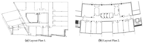 The real experiments were realized in a WLAN environment at the first floor of the Statistical and Operational Research Department and the Living Lab at the University of Technology of Troyes, France, as shown in Figure 4. The layouts had an approximate area of 500 and 550 m and were partitioned into 19 and 21 zones, respectively. A personal computer, with a “WiFi scanner” software, distinguished the APs of the network throughout their MAC addresses. It measured then the RSSIs of their transmitted signals. We used 23 and 38 AP networks in the first and second target area, respectively. Here, we distinguished an AP network from a physical AP. On the same physical AP, several networks existed (different frequencies, different target users, etc). In each experiment, a set of 50 measurements was taken in each zone, of which 30 were randomly used to construct the databases, and the others were kept for test and validation. The user, carrying a personal computer for data acquisition, moved around while regularly collecting measurements in random positions and orientations of the personal computer. Data were also acquired in a normal dynamic environment while all people were moving around and practicing their life in a regular manner. We assumed that these conditions would be similar to when the method was applied in the real environment. Computations were conducted on Version 7.11.2(R2010B) of MATLAB on a laptop with Microsoft Windows 7 and Intel Core i7 CPU. Table 1 summarizes the experimental setup parameters.