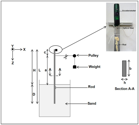 The experimental setup used to perform the static and dynamic tests on the rod is shown in Figure 1. A rigid tank of dimensions 1 m × 1 m × 1 m was progressively filled with dry sand reaching a final height of 0.7 m. The static lateral loads were applied by a set of dead weights connected to the rod described in Section 4.1.1 with a thread passing through a pulley. The static lateral loads were applied with various eccentricities a. To control the direction, and therefore the value of the lateral loads, the height of the pulley was adjustable in order to keep the part of the thread connected to the rod always in horizontal position.