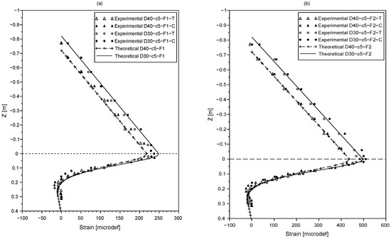 The strain profile along the exposed part of the rod (i.e., for ) was proven to be independent of the soil properties. Therefore, the theoretical strain profile is used to evaluate the accuracy of the fiber optic measurement. Theoretical strain profiles for are computed using Equations (5) and (7), and compared to the strain measurements with the fiber optic.