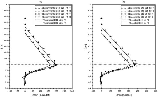The results of the lateral loading tests, for the various configurations presented in Table 1, are shown in Figure 2 and Figure 3. The strains obtained under tension are referred to with ‘T’ and the ones obtained under compression are referred to with ‘C’. Figure 2a,b shows the results of tests conducted with the force F applied at a distance cm from the tip of the rod. Figure 3a,b shows the tests for a distance cm from the tip of the rod.