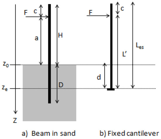This cantilever has a length and a similar deflection to that of the rod partially embedded in sand. The equivalent length therefore corresponds to the free length of the rod in sand H, increased with a “adjustment static length” d corresponding to the distance between the soil level and the equivalent cantilever base as shown in Figure 4.