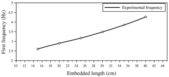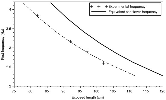 Figure 6 shows that the experimental frequencies are translated against the analytical frequencies of an equivalent cantilever with a free length where is the length of the equivalent cantilever, H the exposed length of the rod and the “adjustment dynamic length” [26]. The latter, , is determined graphically by shifting the experimental frequency curve to fit the theoretical one (the dotted curve in Figure 6). A good agreement with the theoretical frequencies is obtained for cm.