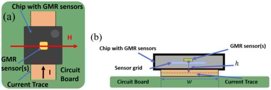 Non-contacting current measurement basic setup using a conducting trace and a giant magnetoresistance (GMR) based sensor chip: (a) plane view; (b) cross section (adapted from [17]).