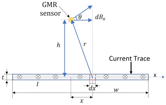 The current, I, from the conductive trace (denoted as “Current trace”) generates a magnetic field, whose component, Bx, will be detected by the GMR sensor. To estimate Bx, we derived an analytical method, which assumes that the sensor is centered above the trace at distance h, Figure 2.