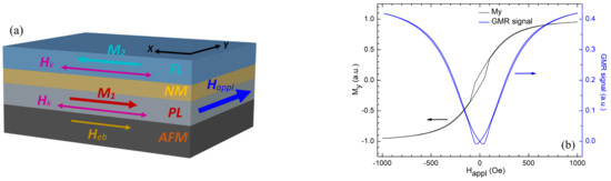 (a) Typical structure of a GMR sensor; (AFM—antiferromagnetic pinning layer; PL—pinned magnetic layer; NM—nonmagnetic spacer layer; FL—free magnetic layer (b) The simulated field dependence of the magnetization along the Oy axis (My) and the calculated GMR effect when Happl is directed over the Oy axis.
