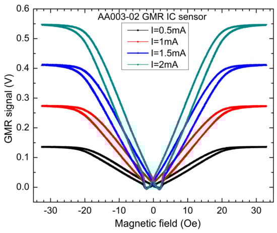 Typical measured field dependencies of the output signal for AA003-02 GMR sensor for different driving currents.