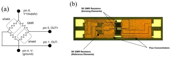 Before implementing our differential measurement setup, initial tests were done using an evaluation kit, NVE AG003-01E, for current measurement [24] with AA003-02E GMR sensors. The AA003-02E sensor is a differential system on its own as can be seen in Figure 5a,b. The sensor operates as a Wheatstone bridge with four GMR elements, from which, two are magnetically shielded and two are active sensors. The structure is well balanced, such that it delivers an output voltage when , as shown in Figure 4.