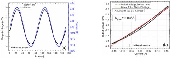 The detection system was characterized by applying a very low frequency 0.16 AC current in the conductive trace (Figure 7, Figure 8 and Figure 9). For these tests, the sensors were supplied with a constant current of 1 mA. The tests were made with unbiased (Figure 7), and biased sensors (Figure 8 and Figure 9). Figure 7 presents the output characteristics obtained when the sensor is unbiased. We must remark on the nonlinear response of the sensor and the hysteretic effect of the output signal, Figure 7a,b.