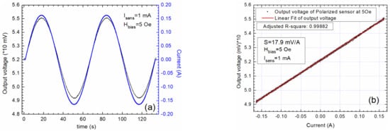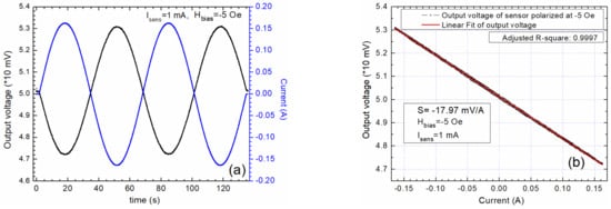 Output characteristics when the sensor AA003-02 is biased at −5 Oe: (a) Comparison between the input current and the output voltage wave forms; (b) the output voltage as a function of the applied current through the current trace; the sensitivity is −17.9 mV/A.