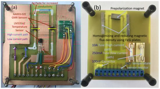 Custom PCB for current measurement using GMR sensors: (a) backside; (b) frontside. Note that the Ag paste is used to increase the cross section (and consequently, electrical conductivity) in the contacting areas, thus reducing the overall electrical resistance of the “U” shaped current trace.