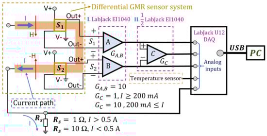 A high sensitivity non-contacting current measurement experimental setup based on giant magnetoresistance (GMR) sensors was implemented. The sensitivity of this detection setup is between 0.0272 to 0.0307 V/A with low (40 mA) hysteretic effects. A biasing magnetic field was used to linearize the field dependences of the sensors. Moreover, the implemented differential GMR system is very versatile, being able to measure both DC and AC currents. The current measurement system (Figure 12a) was proven to be able to measure accurately and for extended periods of time in DC from 75 mA up to around 4 A, and in AC from 150 mA up to 4 A. This system has the following advantages: high sensitivity, galvanic isolation, thermal stability (when operating at specified parameters), immunity to low external magnetic fields, and preservation of signal integrity for the input current, as can be seen in Figure 15 and Figure 18. These results were obtained without EMF shielding or filtering systems. The custom PCB for the system was designed to measure currents up to 10 A (by taking into account the copper trace width [17]), however, in practice, it was observed that significant heating occurs when measuring currents larger than 4 A for an extended period of time (Figure 16).