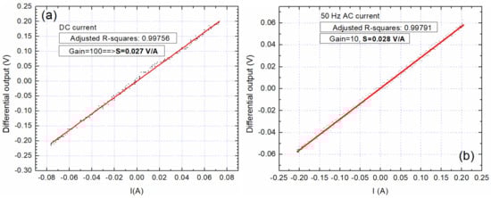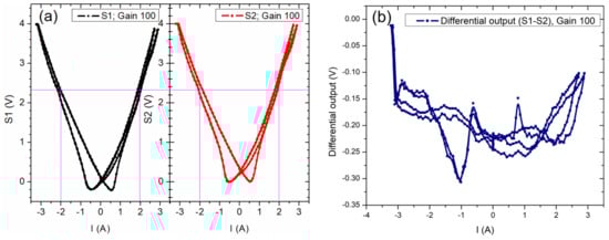 The results presented in this section are a summary of many tests done for different input currents both in DC and AC. From Figure 13a we can denoted that the sensors response is nonlinear in the −1.5 A to 1.5 A current region, which would not allow low currents measurement without biasing. Figure 13b presents the output characteristic of the differential system obtained for unbiased sensors for a DC current between −3 A to 3 A. The response from each sensor is slightly different and presents a hysteretic behavior. The differential output is chaotic, and thus unusable.