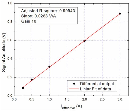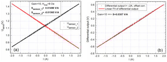 Since two almost identical AA003-02E sensors were used, the result is a double differential measurement system where the benefits and precision compared with a single differential measurement setup were further amplified. Figure 12b presents how the differential current measurement system operates: The sensors were both biased with a field of 8 Oe. From Figure 10a, one can note that since the sensors were placed in such a way that they operate in antiphase, the differential output from the sensors will subtract the influence of other external magnetic fields. In essence, any external homogenous magnetic field (not directly from the current trace) affecting both sensors equally will be subtracted from the differential output as one can see from Equation (7).