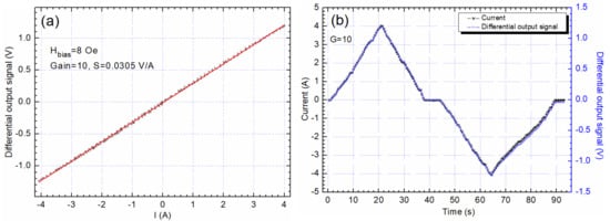In Figure 15a, the system’s output when measuring a variable DC current from −4 A to 4 A is presented, while Figure 15b presents the signals variation over time. As expected, the sensitivity is almost the same but the hysteretic effects are lower. Above 4 A, the thermal stability of the setup is negatively impacted as heating occurs.