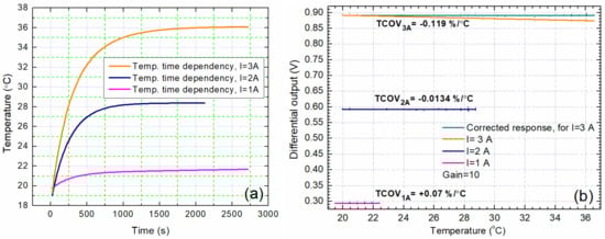 From Figure 16b we found a linear decrease of the output voltage, which is more important for I = 3 A where a larger amount of heat can be transferred to sensors and, hence, we expect a larger temperature variation of the GMR effect. This has an effect on the setup we used, but this can be compensated by applying a correction factor proportional with the measured temperature variation and using the calculated TCOV. Figure 16b presents the compensated response for I = 3 A through the conductive band.