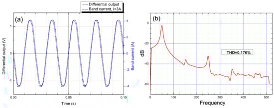In Figure 18a, the AC response of the system when measuring a 50 Hz sine waveform at 3 A is shown. The harmonic analysis for this measurement is shown in Figure 18b. A THD (total harmonic distortion) of 0.176% was obtained in this case. We can notice that the signal integrity is very good with little to no distortion (the fundamental frequency is the major amplitude, while the effect of the 3rd, 5th, and 7th harmonics is negligible). Note that the frequency limits of the response in AC are mostly limited by the DAQ system, as the sensors have a theoretical maximum frequency response of 1 MHz [18]. Further studies can be done to find the actual AC frequency limitations of the system.