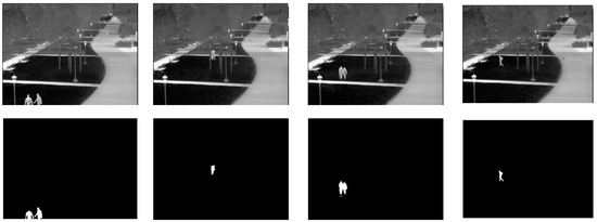 This research used three infrared image datasets, named “university”, “beach”, and “shore”, for training and testing the person detection algorithms. The “university” dataset was taken from on top of a pedestrian bridge at a university campus using an infrared (FLIR) camera. The “beach” and “shore” datasets were taken from a rooftop of a building next to a public beach in Korea using an infrared CCTV. All datasets were collected at night-time and labeled at the pixel level. Table 1 shows the details of the datasets whereas Figure 1, Figure 2 and Figure 3 depict sample original and labeled images in all datasets. All datasets were split into 80% training data and 20% test data. The split was carried out while ensuring that the images in the training data and test data occur at different time segments in the original video.