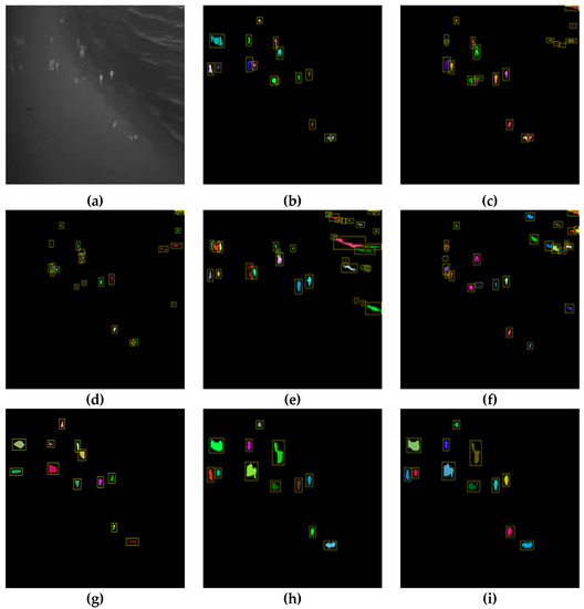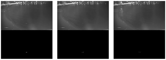 Figure 7, Figure 8 and Figure 9 show a visualization of the detection results compared to the baseline methods whereas Table 2, Table 3, Table 4, Table 5, Table 6 and Table 7 show the numerical results. Figure 7, Figure 8 and Figure 9 show that our method obtains much better detection results, almost approaching the ground truth, compared to the baseline methods. Our method is able to correctly detect humans while ignoring background objects such as lamp posts and waves. This is confirmed by the numerical results in Table 2, Table 3, Table 4, Table 5, Table 6 and Table 7, where our method obtains the best pixel-level and object-level F1-scores in all datasets. In the “university” dataset, the use of temporal information as CNN input is able to improve the detection performance whereas, in the “beach” and “shore” datasets, the temporal information was not as effective. This is because the “beach” and “shore” datasets are highly dynamic due to moving waves, thus the detector could become overly sensitive to random motions of the waves and cause false positives.
