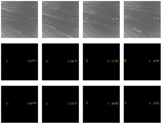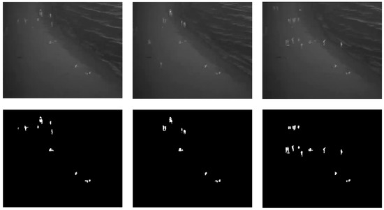 Detection results over time for the beach dataset. The top row shows the original infrared image; the middle row shows the ground truth; the bottom row shows the detection results based on our proposed method.