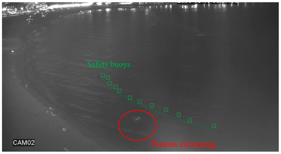 The “university” dataset was used to benchmark the performance of night-time human detection from an overhead viewpoint in brightly lit urban areas. The dataset was taken on a university campus with many different light sources that pose a challenge to intensity-based detection algorithms. On the other hand, the “beach” and “shore” datasets were used to practically evaluate human detection for night-time drowning prevention. Figure 4 shows the layout of the night-time scene captured by the beach CCTV camera. The scene consists of a public beach bordered by safety buoys with several groups of people scattered throughout. The task of interest was to automatically detect any persons swimming in the sea area, which is prohibited during night-time. This is a challenging task because the area of interest only constitutes a small region in the image since the camera is located far from the scene. Other challenging factors include noise from the waves and irregular lighting from the surrounding buildings. To partially overcome these problems, the original image was cropped to contain only the area of interest which is the sea area close to the beach. For this reason, only the people that intruded into the water area were detected, whereas the people on the beach were not detected.