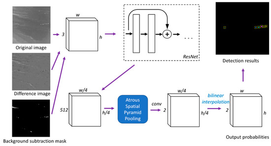 Deep neural networks have been shown in the literature to demonstrate state-of-the-art performance in various image processing tasks [31,32,33]. Even though infrared images may have a different appearance compared to visual images, similar techniques can still be applied. This study used CNN designed for the task of semantic image segmentation. The architecture has a base network of ResNet [31] and top layers with atrous convolutions [34]. The network takes in inputs of N×N×3 images and outputs N×N pixel-wise labels. The source code implemented in this paper has been made publicly available on GitHub (https://github.com/jingdao/IR_detection).