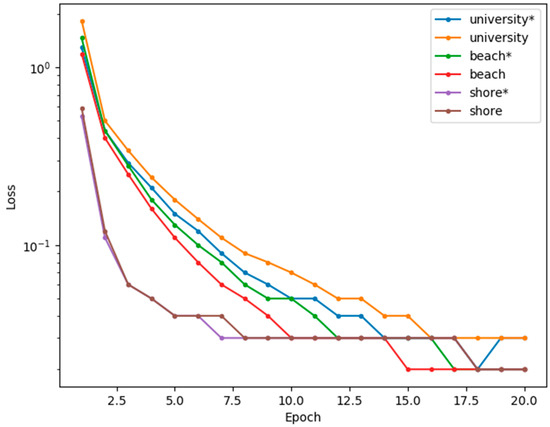 Two network models were trained for each dataset. In the rest of this paper, “university*”, “beach*”, and “shore*” refer to the scenario where all three input channels (i.e., containing temporal information) were used whereas “university”, “beach”, and “shore” refer to the scenario where only the first input channel was used (i.e., no temporal information). Figure 6 shows a graph of the training loss for each dataset for the first 20 epochs of training. The training progress shows a similar trend for all datasets, where the loss function rapidly decreases during the first few epochs and then gradually plateaus afterward. The graph also shows that the training loss is generally higher for the “university” dataset compared to the “beach” and “shore” datasets. This may be because the “university” dataset has a wider range of pixel intensity values since it is in a lighted urban scene.