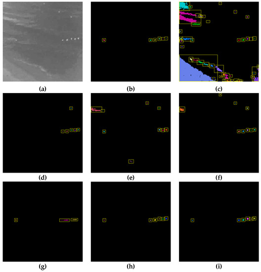 Detection results for the shore dataset: (a) original infrared image, (b) ground truth, (c) simple thresholding, (d) adaptive thresholding, (e) background subtraction, (f) K-means clustering, (g) baseline CNN, (h) our method, and (i) our method*.