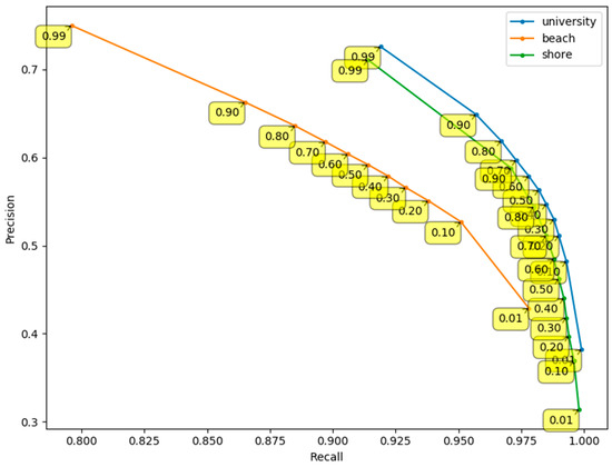 Figure 11 shows the precision-recall curve for pixel-wise detections in the “beach”, “shore”, and “university” datasets. The curve is constructed by applying different detection thresholds to the pixel-wise CNN confidence output. As the detection threshold increases, the precision values increase whereas the recall values decrease. To maximize the F1-score, a final detection threshold of 0.99 was used.