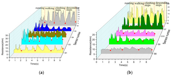 In S3, S5, S9 and S10 the changes of resistance waveform in each region are different and the resistance is higher during running than during the other three movements. When walking, the change of resistance is clear. A big difference is observed between the upper and lower steps in S3 and S10, whereas the change of resistance is similar in S5 and S9. Although fabric sensors have shown excellent performance in human motion recognition and other fields, most sensors are single or integrated as additive parts in the test [5,40]. In this work, conductive yarns were directly positioned and knitted into elastic leggings to test different area sensors and determine the best sensor area.
